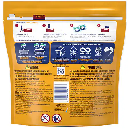 One pak = Regular / Lightly Soiled Loads Two paks = Large/Heavily Soiled Loads or Tough Odors 1. Handle paks with dry hands. 2. Add pak to drum. 3. Add clothes. 4. Reseal bag after use. 5. Wash hands with soap and water after use. Do not use for hand washing or pre-treating. Do not open paks ©Church and Dwight